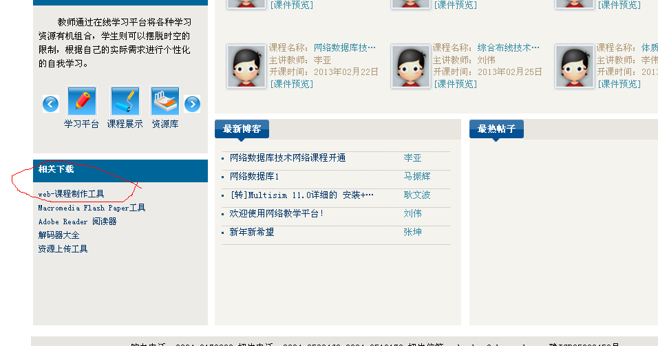 3、进入首页,下载WEB课程制作工具,并安装。此工具是制作网络课程的一个软件(WCS课件制作室),见下图: