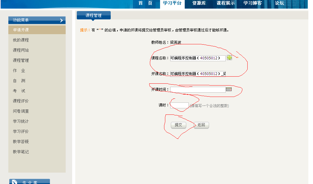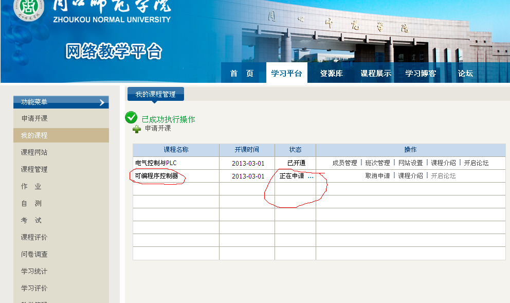 8、显示为“正在申请”,请联系教务处教学科审核,我审核批准,并把您设置为您所申请课程的课程负责人。见下图: