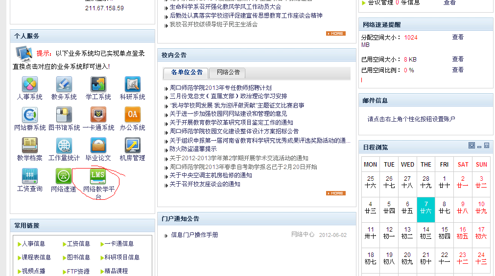 1、老师登陆校园网主页(内网),见下图: 2、老师选中网络教学平台进入,见下图: